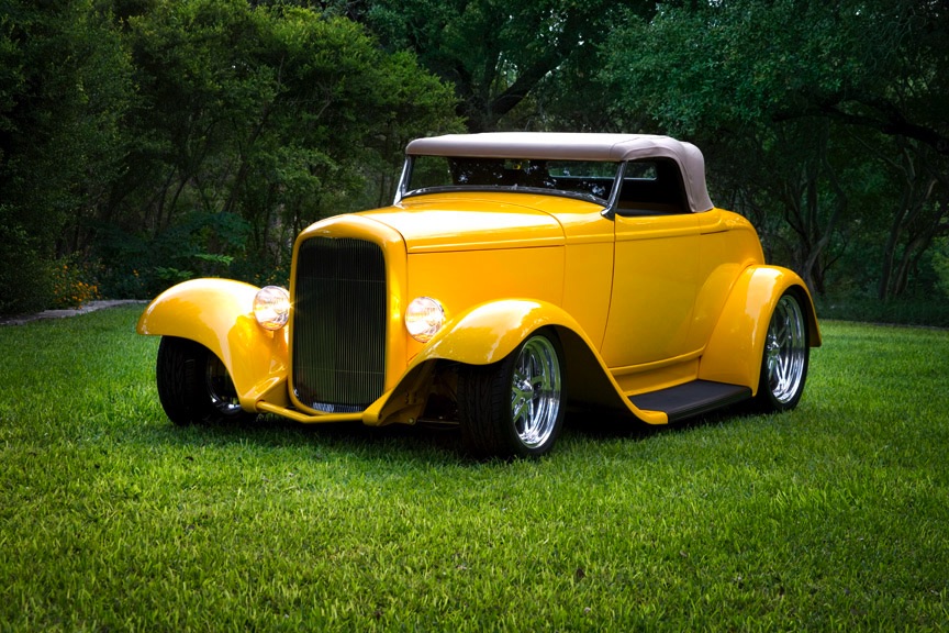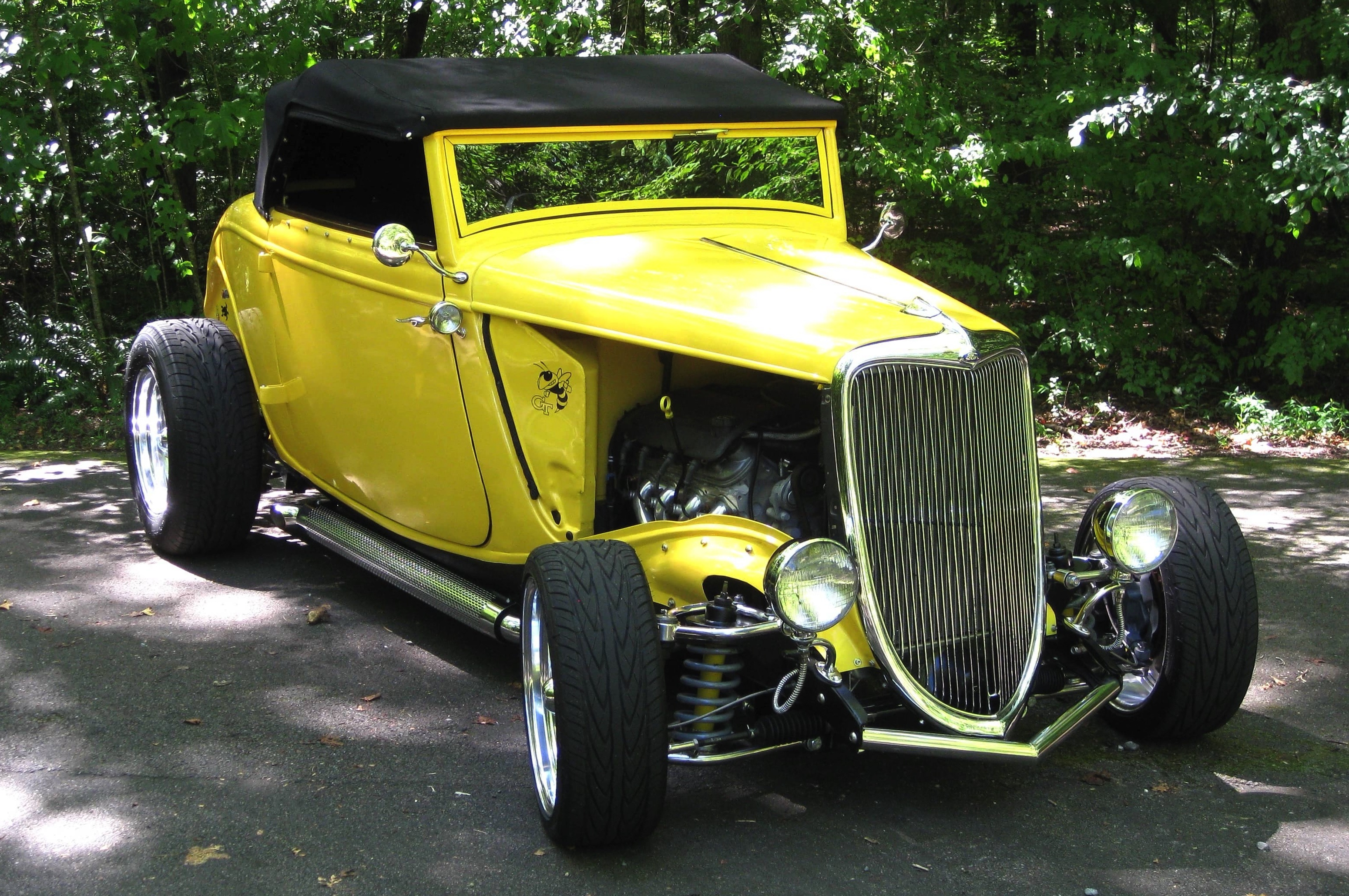 This slick Corvette Yellow Ford roadster is an all-steel body with a fiberglass trunk lid, and nothing captures the go-fast vibe of a salt flats racer like a fenderless '34. Lean and mean with no extra fat anywhere, it's the purest distillation of the hot-rodding spirit and offers traditional details combined with a bit of modern technology to create a unique machine. Up front there's a beautifully finished '34 grille that has been given a show chrome finish, and it hangs right above a V'd spreader bar. The open hood sides show off the Corvette powerplant, and you can clearly see that finish quality is excellent. Original trim pieces like the cowl lights, scroll-like door handles, and a plain radiator cap give it an authentic feel, while modern paint makes it look like a million bucks. And this is one of the few rods that looks as good with the top up as it does with the top down.