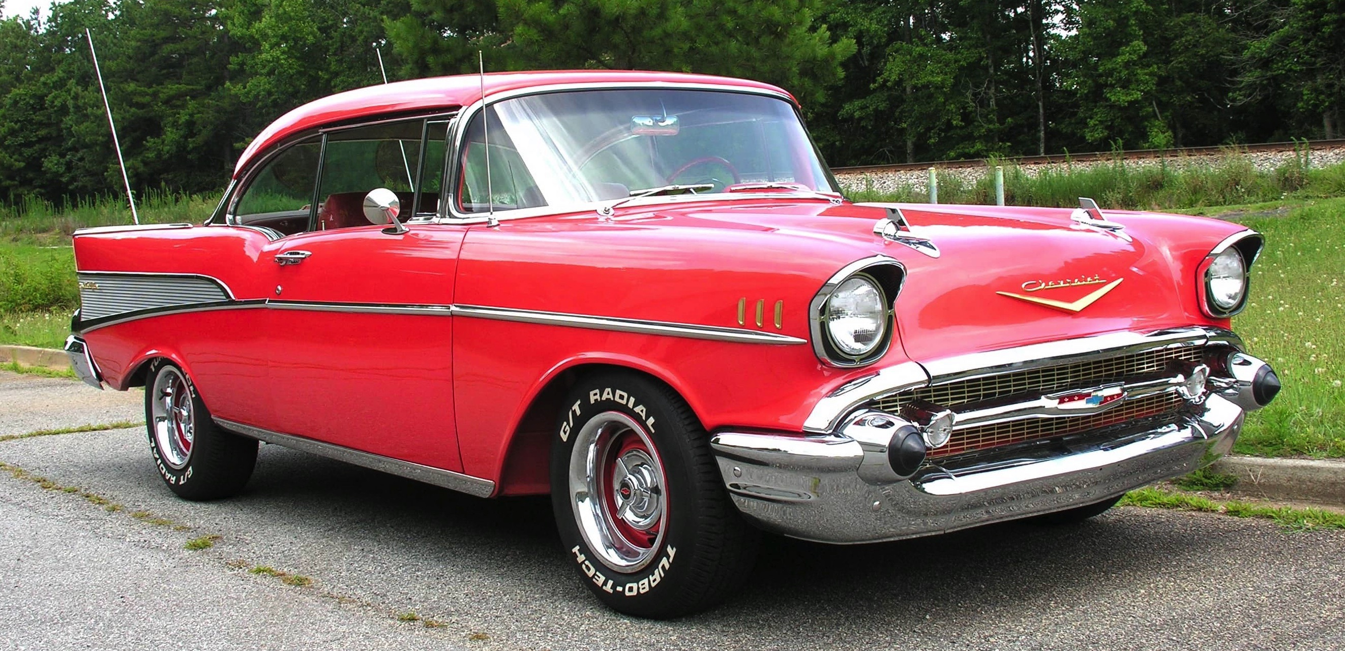 Check out Skip's Orange/Red 1957 Chevy Bel Air with 350ci engine.