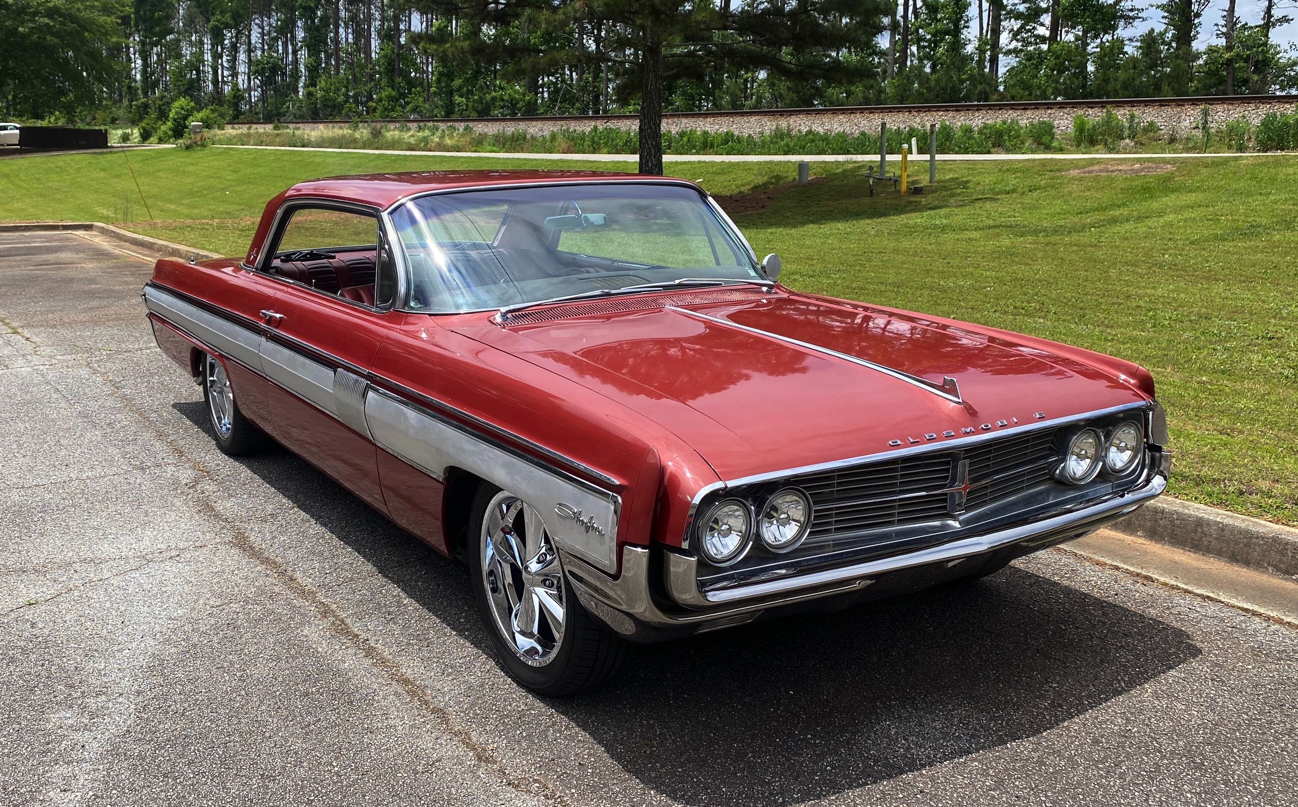 This is a rare 1962 Oldsmobile Starfire with a ProStreet LS376/480 Engine with 4L70E Automatic Transmission installed by Southern Performance Systems. A lot was done to this car. Obviously the engine and transmission were upgraded but we also beefed up the rear end, updated the fuel delivery system for EFI with a custom built fuel tank, upgraded the brakes to Wilwood brakes, and improved the steering with new Flaming River column and hydroboost system. Improved the suspension with RideTech control arms and AFCO coil-over shocks. The interior was renewed by our friends at Fountain’s Upholster. This car rides and drives like a modern car with that classic look. Updates to the interior include Vintage Air AC system, Dakota Digital gauges, American Autowire body harness, and a Custom Sounds radio with that classic look.