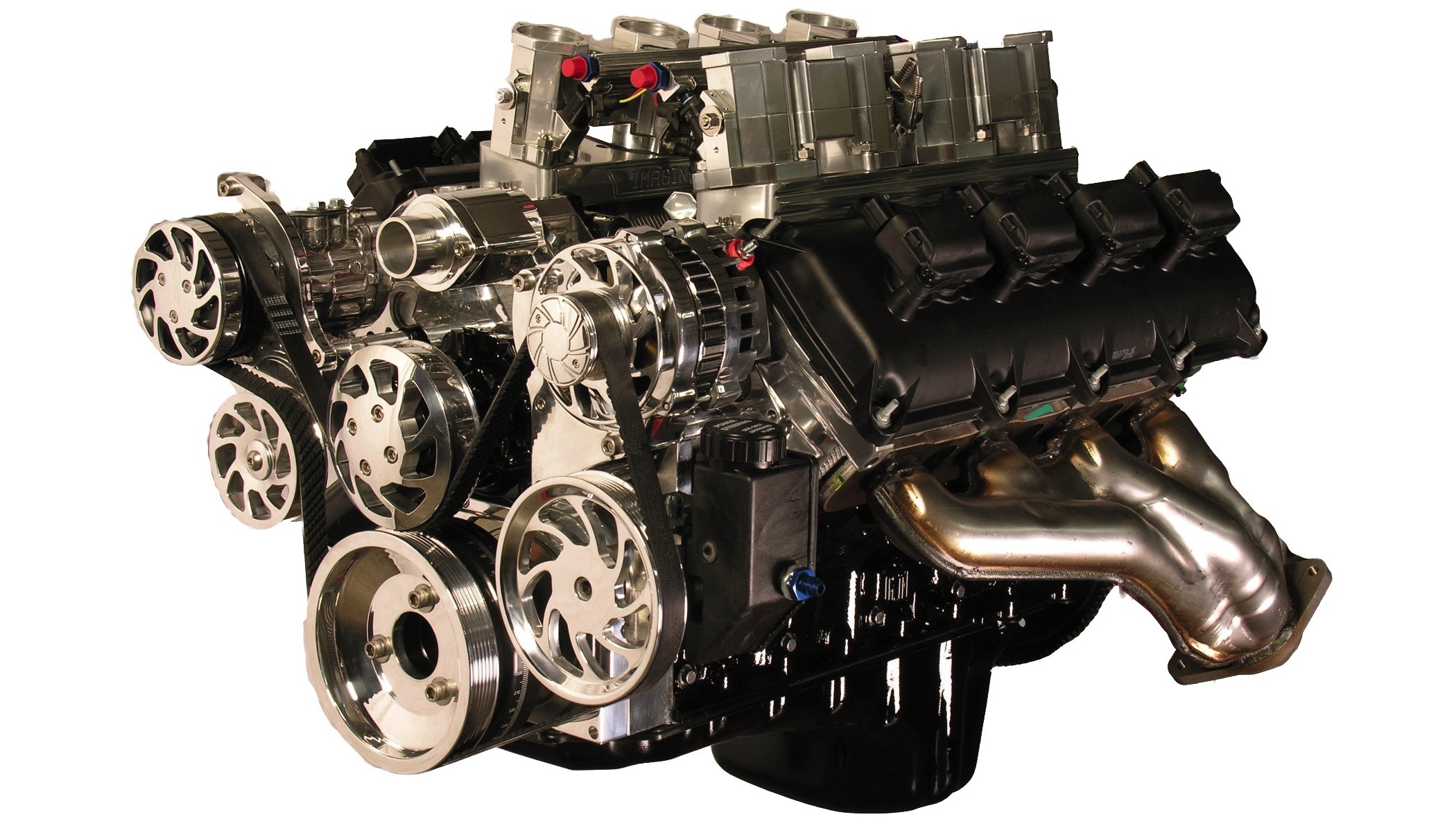 This engine features an Imagine Fuel Injection System, polished billet serpentine kit, timing cover, 12-Point ARP Bolts, custom two-piece billet valve covers that conceal the LS coil pack and Deep Ruby Red Paint scheme for both the both and 4L70E transmission. Fuel injection stack system add anywhere from 40 to 100 HP depending on cam and head setup. 490 Horsepower shown.