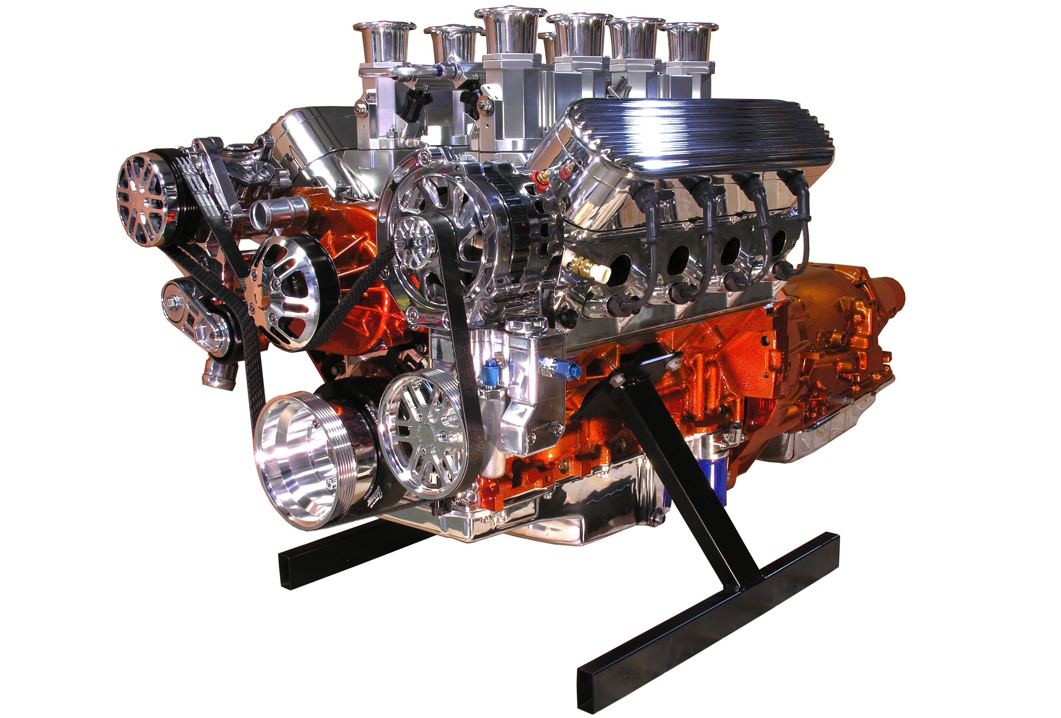 This bueatiful engine features the Imagine Injection Stack System, polished billet serpentine sysem, polished 2-Piece hidden coil valve covers (finned), polished oil pan and timing cover, custom painted 4L70E transmission with chrome oil pan, 12-Point ARP Bolts and custom Sterling Orange paint job.