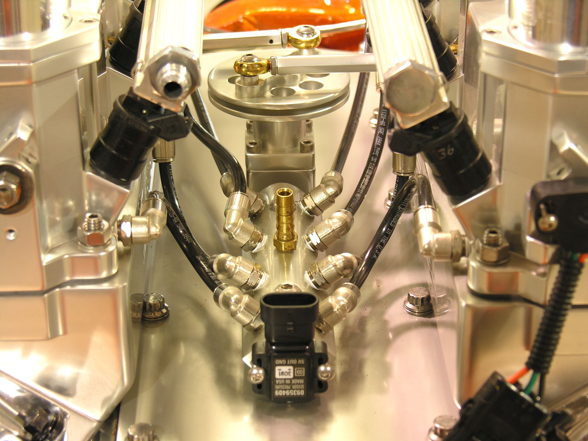 This Unique Engine features the Imagine Injection Stack System, Polished Billet Accessories, Polished 2-Piece Hidden Coil Valve Covers (Finned), Polished Oil Pan and Timing Cover, Custom Painted 4L70E Transmission with Chrome Oil Pan, 12-Point ARP Bolts and Custom Sterling Orange Paint Job.